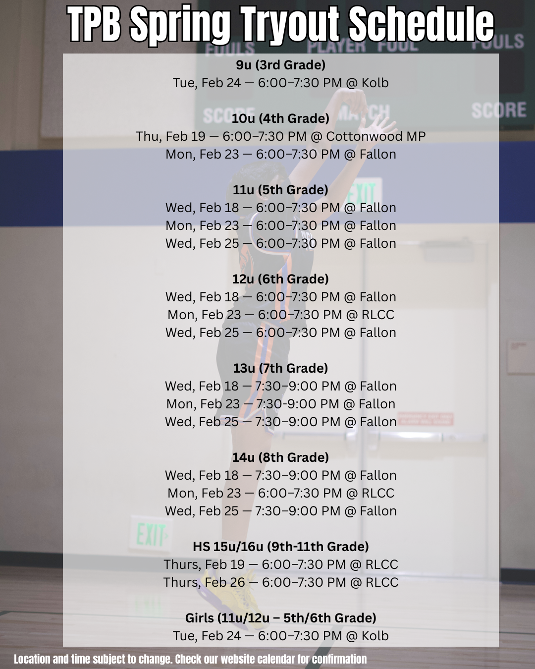 Tryout schedule and location subject to change. Go to CALENDAR for schedule.